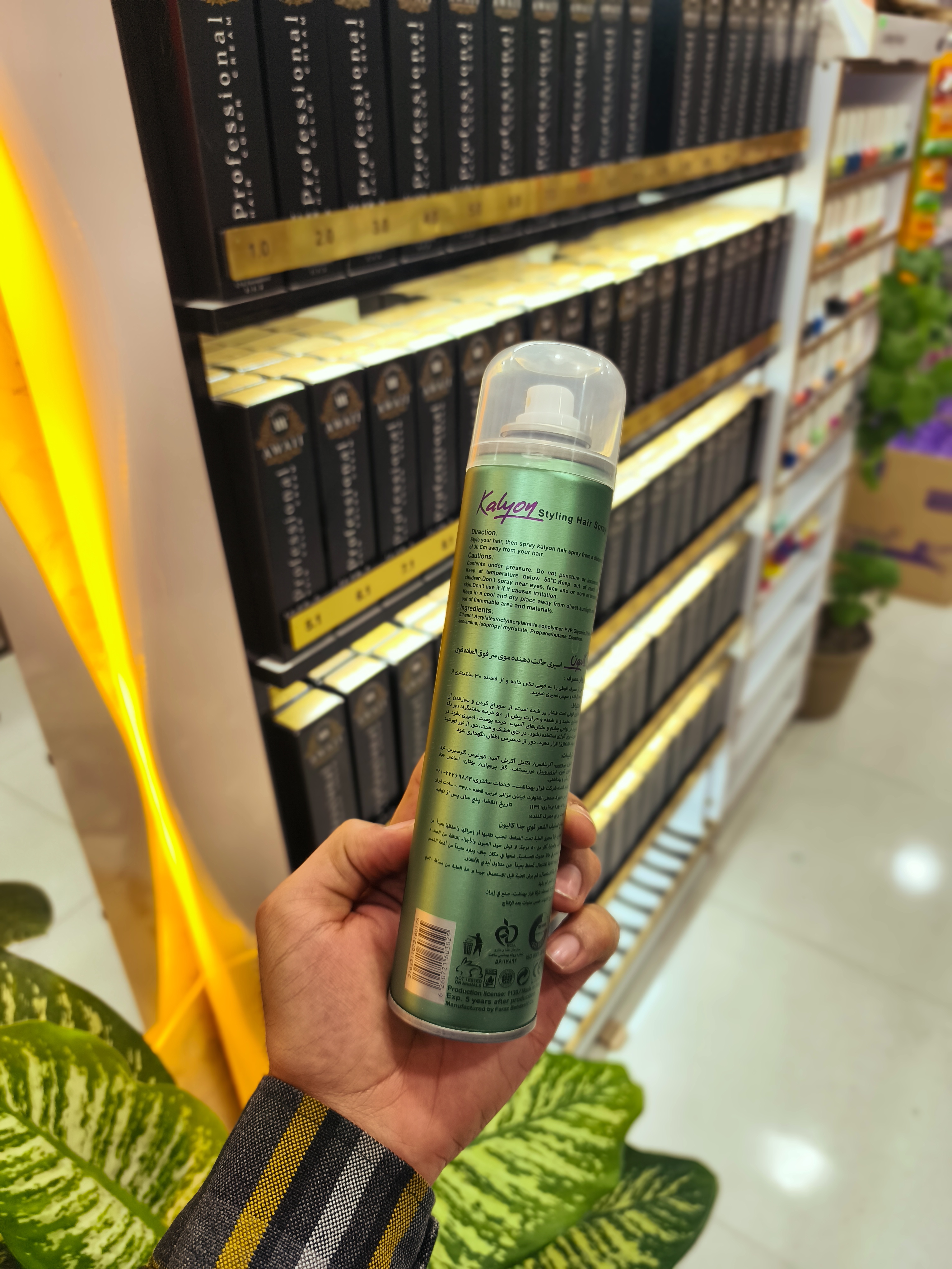 ابتدا قوطی تافت حالت دهنده موی کالیون را بخوبی تکان دهید و از فاصله 30 سانتی متری بر روی موهای خشک اسپری کنید