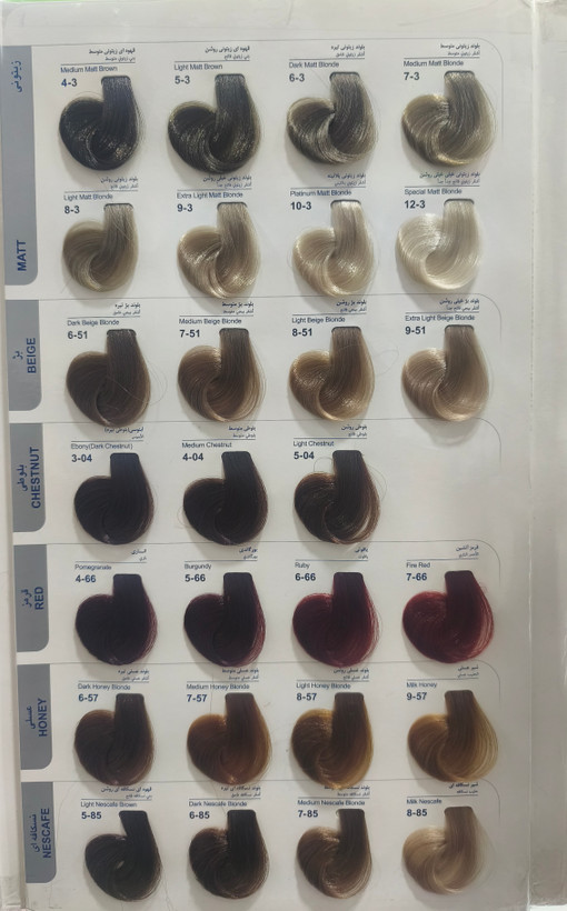 سایر توضیحات: حاوی روغن بادام ، روغن هسته انگور ، روغن آرگان - رنگ مو فقط با رنگدانه های لاونشتاین آمریکا - حاوی ویتامین E ، A ، گروه B
